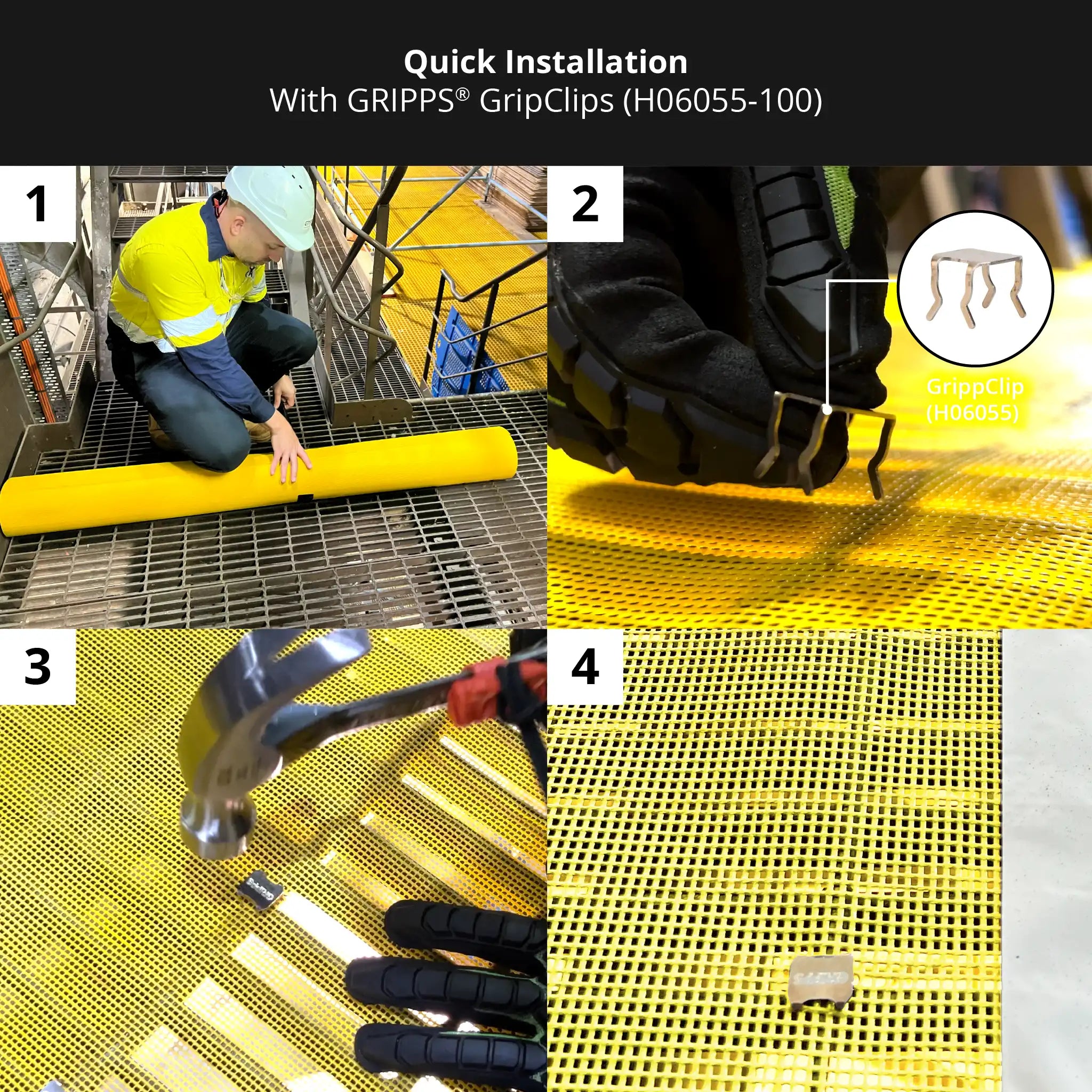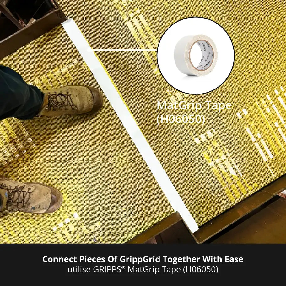 GrippGrid Yellow FR Grid Mesh Matting 90 ft x 5 ft (27m x 1.5m) provides a highly durable and reusable solution to mitigate the risk of dropped/falling objects on grid mesh platforms.